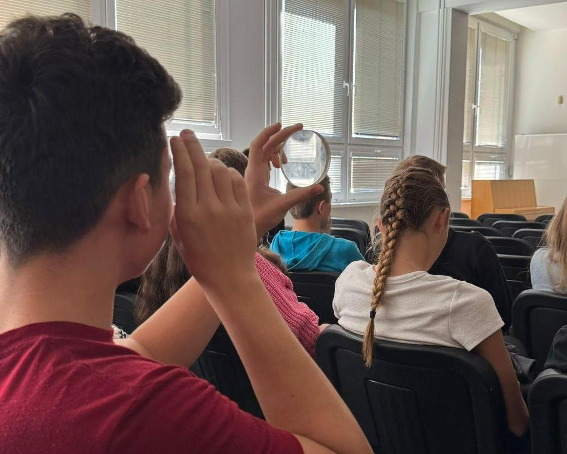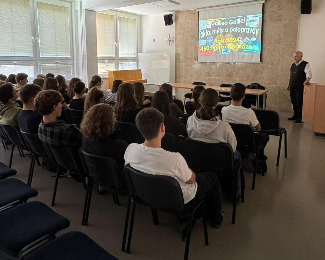 Studenti gymnázia se zúčastnili přednášky ke 460. výročí narození Galilea Galileiho. Od pana RNDr. Jiřího Prudkého se dozvěděli spoustu zajímavých informací o jeho životě, objevech, sporech s církví a také byly vyvráceny některé mýty, které mezi lidmi kolují o tomto významném astronomovi a filosofovi. Na závěr si po každé přednášce odnesli úspěšní řešitelé kvízu malou odměnu.