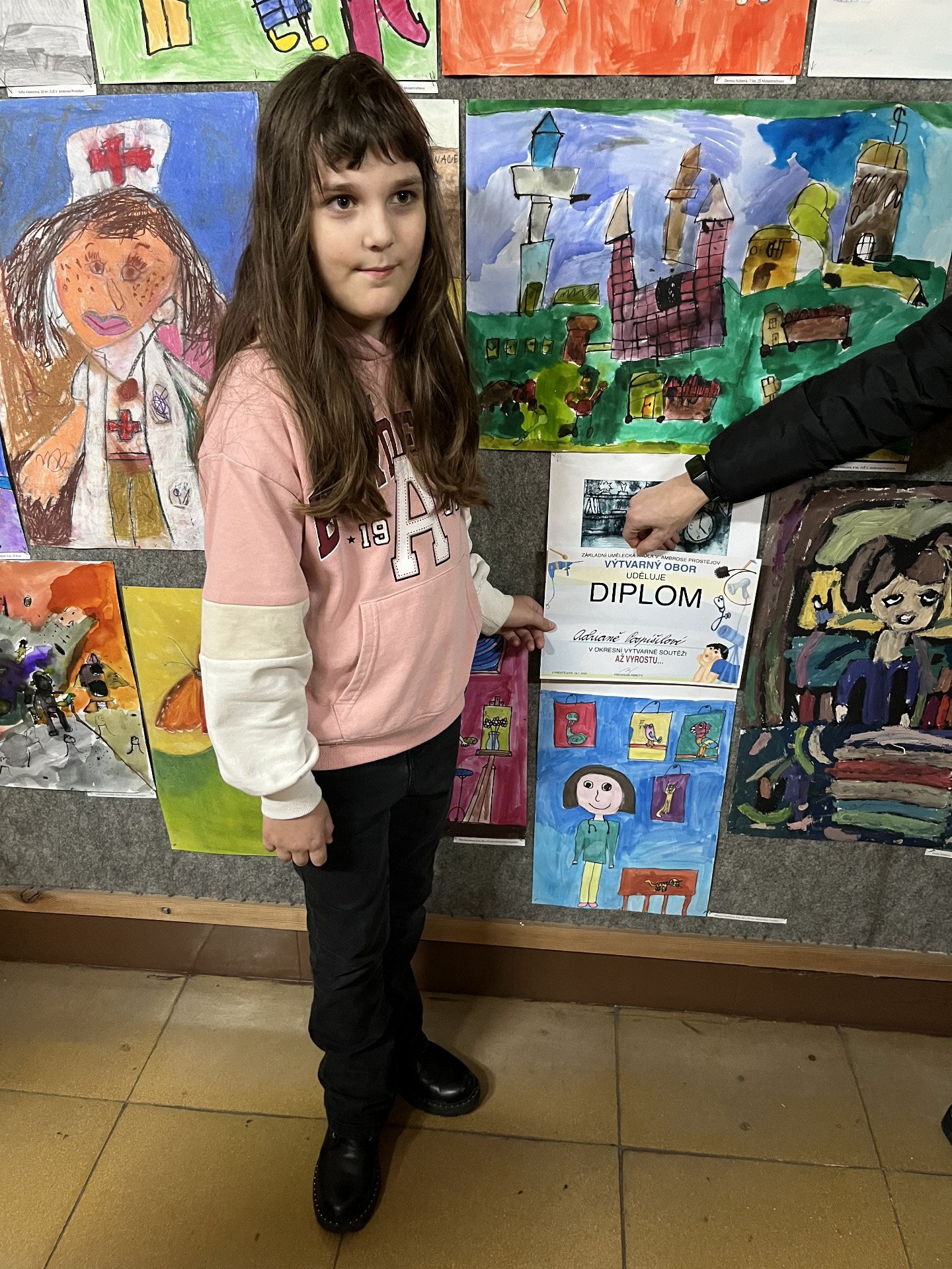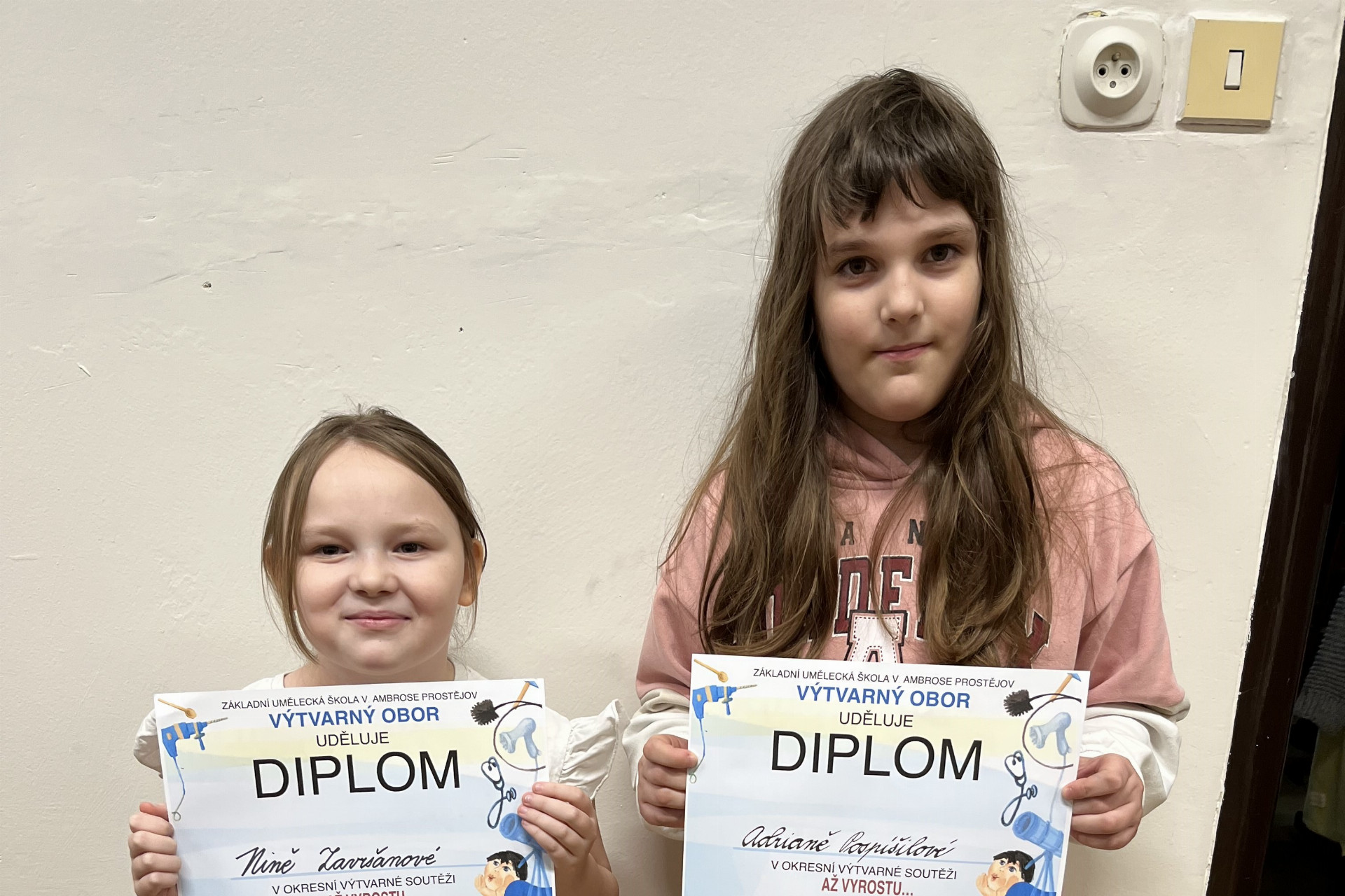 Ve čtvrtek 13. 2. 2025 v podvečer byly dvě naše žákyně ze 3.A, Adriana Pospíšilová a Nina Završanová, pozvány na slavnostní vernisáž výstavy oceněných prací z okresní výtvarné soutěže Až vyrostu… Této soutěže se zúčastnilo celkem 79 dětí z různých škol okresu Prostějov. Odborná porota pak ocenila 35 nejzajímavějších prací, mezi nimi také velmi zdařilá díla našich šikovných malířek. Výstava potrvá do 31. 3. 2025 v prostorách Výtvarného oboru ZUŠ V. Ambrose, Vápenice 3, Prostějov.