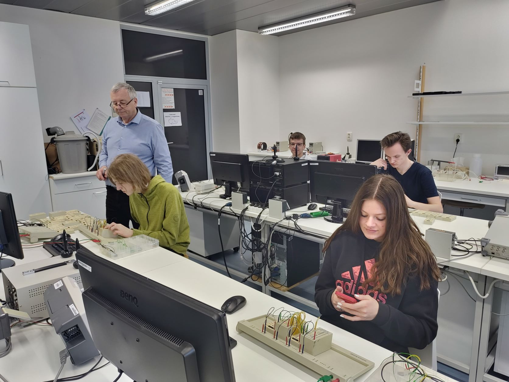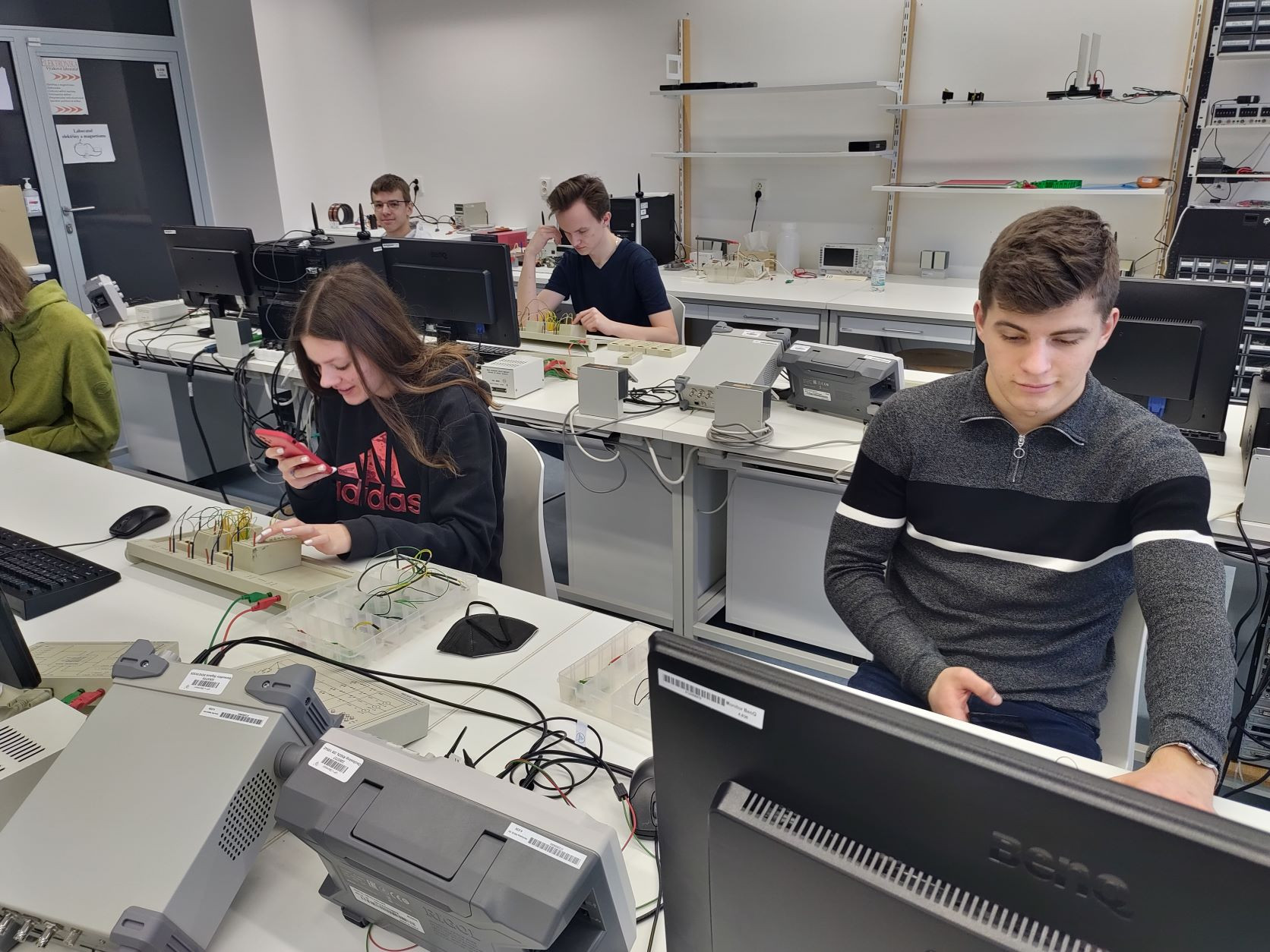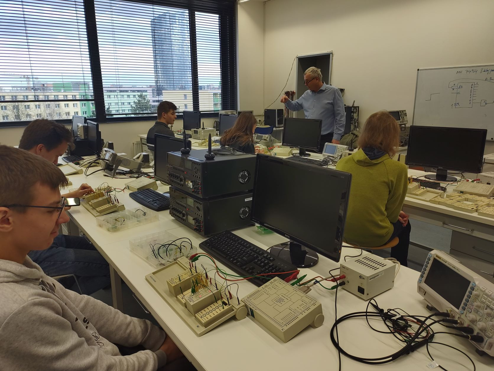 Dne 11. 2. 2022 vyrazil matematicko-fyzikální seminář třídy 2.V pod odborným dohledem našeho pana ředitele RNDr. Ing. Rostislava Halaše a pana zástupce RNDr. Petra Janečka na exkurzi na Přírodovědeckou fakultu Univerzity Palackého v Olomouci. Studenti měli možnost jedno celé dopoledne pracovat ve speciální laboratoři číslicové techniky a sami si vyzkoušet zapojování různých číslicových obvodů.