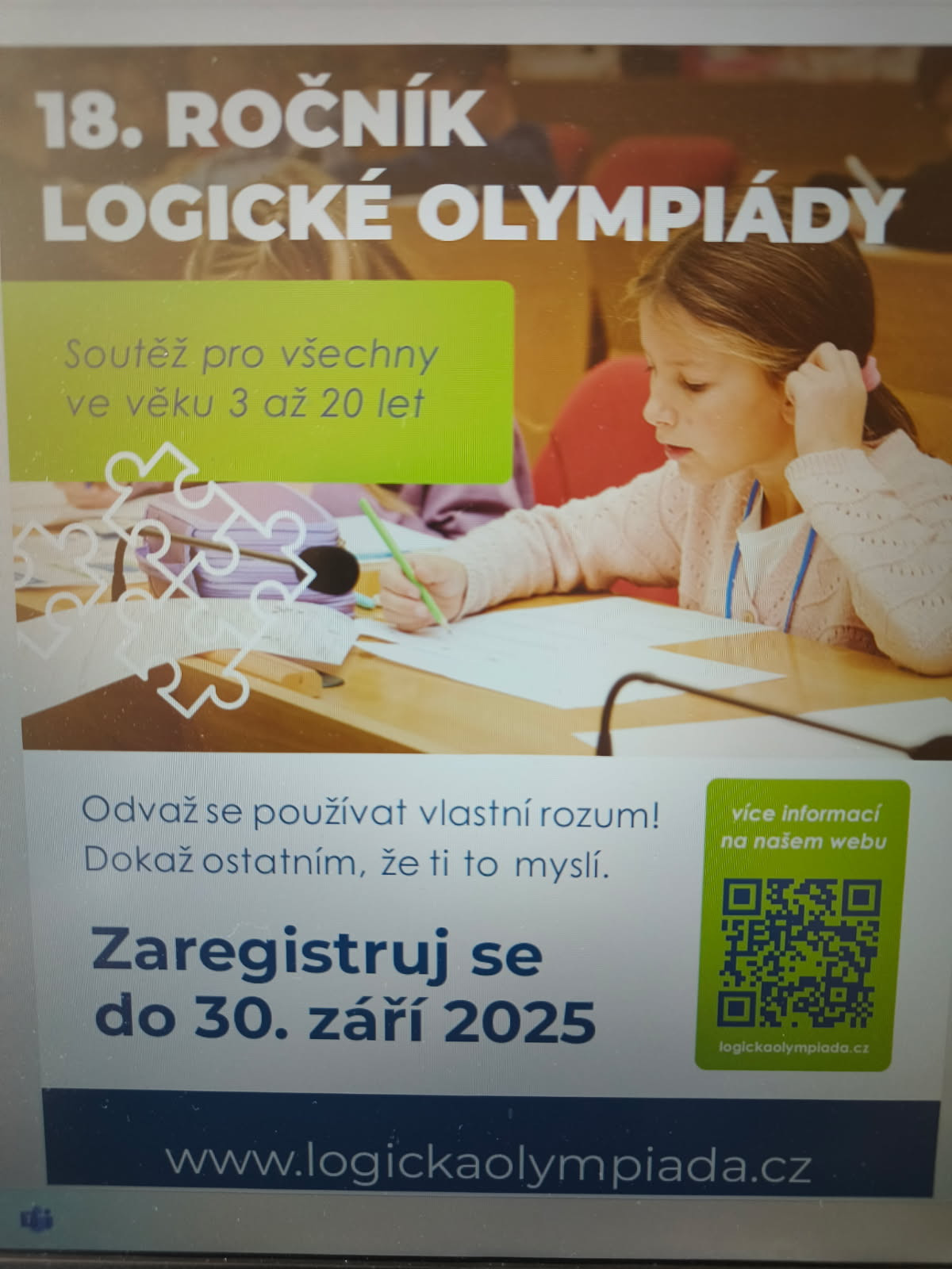 Naše škola je zapojena do Logické olympiády pořádané Mensou ČR. Pokud máte zájem o účast, zaregistrujte se do 30. září 2025 na www.logickaolympiada.cz. Základní kolo proběhne on-line pro žáky 1. a 2. třídy 22. - 28. října, pro žáky 3.- 5. třídy 1. - 7. října 2025 a pro žáky 2. stupně 8. - 14. října. Žáci se mohou připojit ve škole, doma, v knihovnách, zkrátka kdekoliv, kde je připojení k internetu.