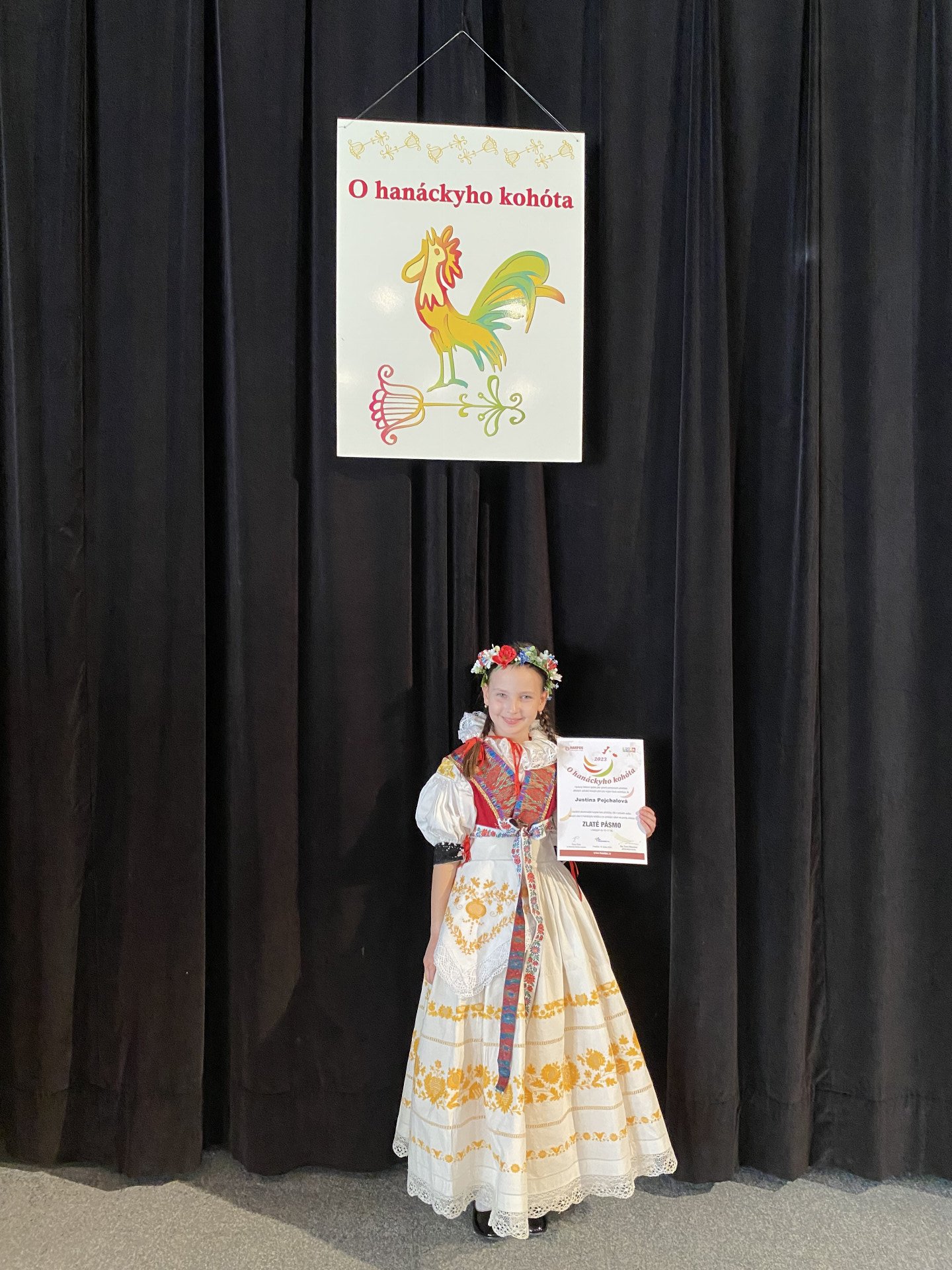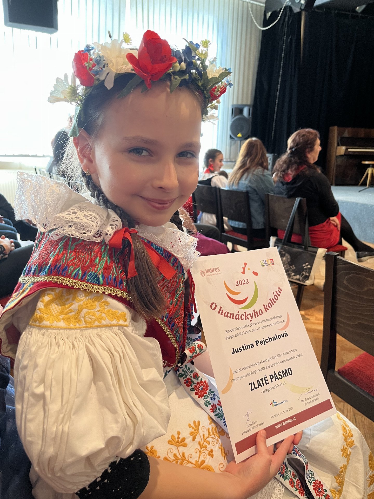 Ta před odbornou porotou předvedla svůj hanácký pěvecký repertoár v kroji a s doprovodem skvělé Cimbálové muziky Parádnica z Velké Bystřice. Za svůj výkon Justinka získala zlaté pásmo. Je velmi pěkné, že mezi dětmi a pedagogy má náš hanácký folklór své pevné místo a nejen v lidových písních stále žije.
