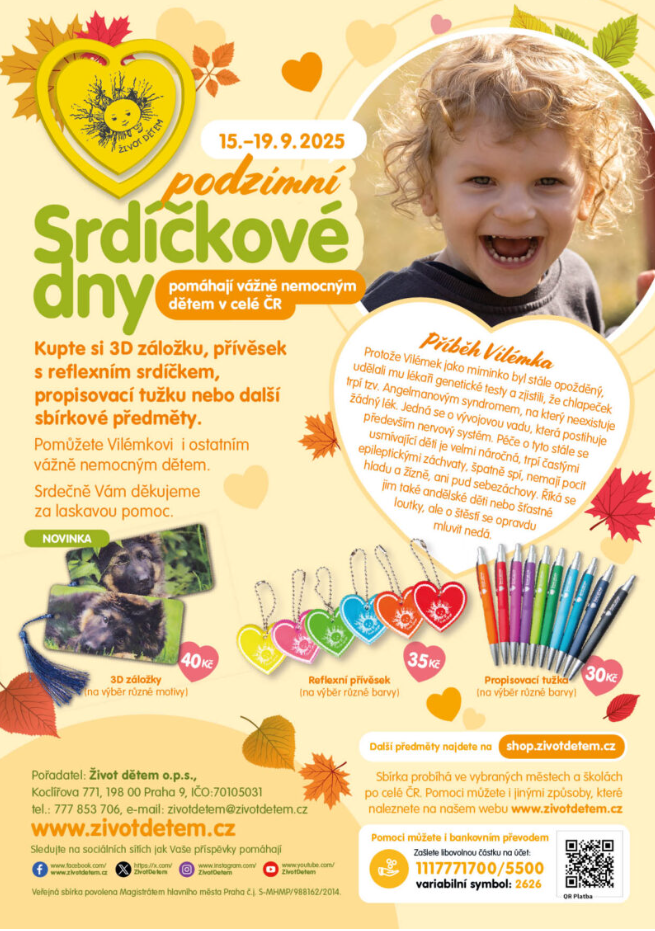 Již tradičně v pondělí 15. 9. 2025 proběhne na naší škole sbírka Srdíčkový den pro nadaci Život dětem.