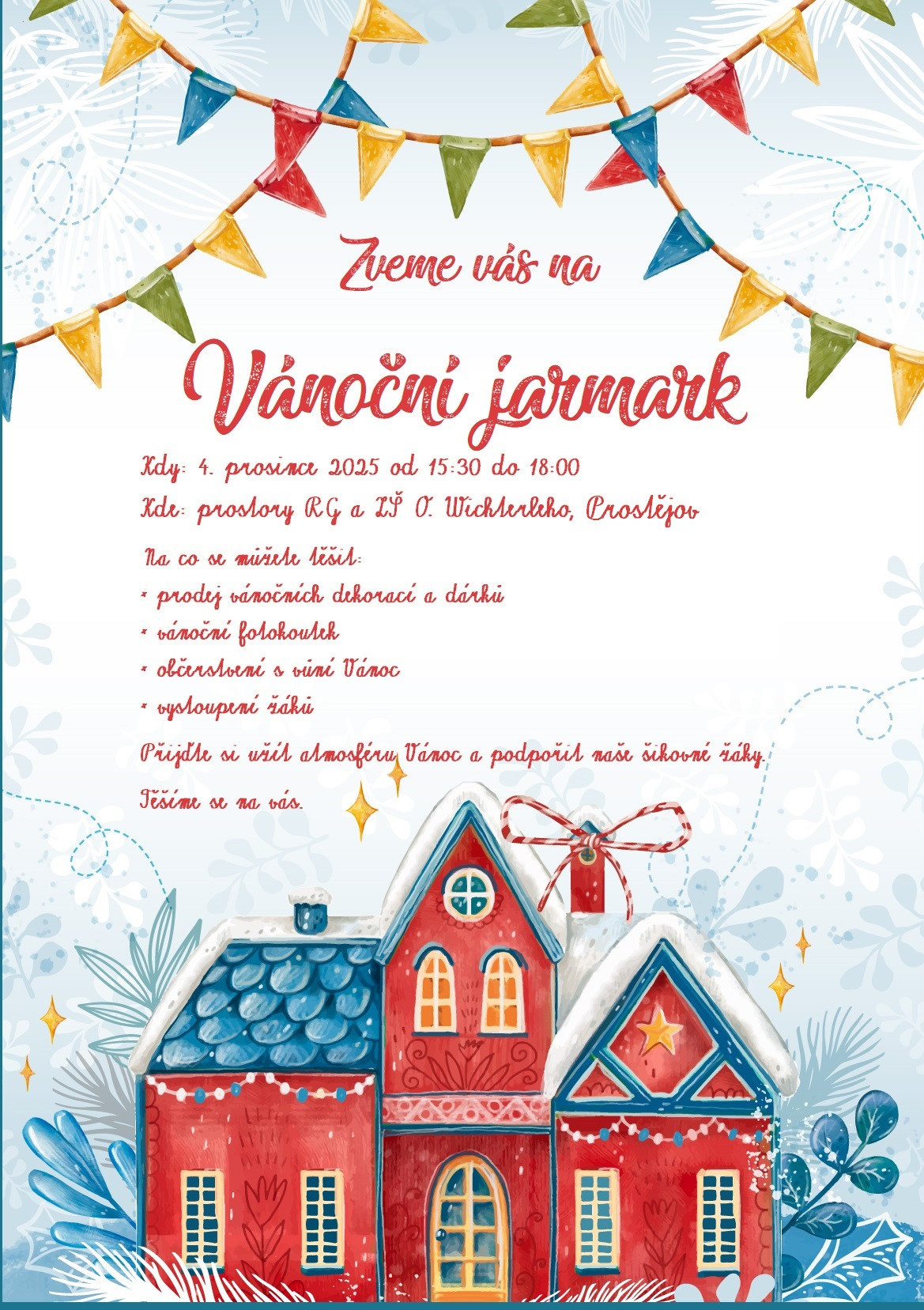 Srdečně Vás zveme na Vánoční jarmark, který proběhne v naší škole 4. prosince 2025 od 15:30 do 18:00.