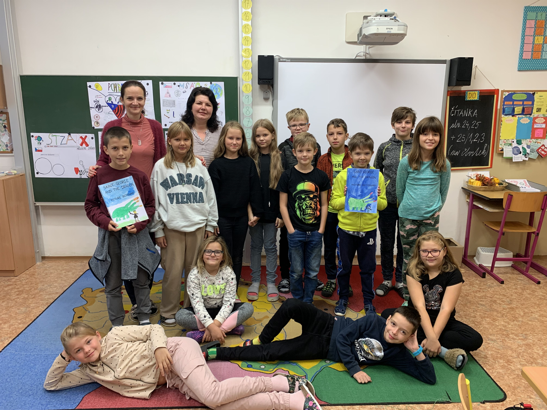 K legendě v anglickém jazyce Saint George and the dragon žáci vytvořili obrázkový slovník. Příběh s napínavým dějem o drakovi děti moc bavil a výroba vlastní knihy – obrázkového slovníku je opravdu pohltila. Protože ve škole máme také děti s ukrajinskými kořeny, a dokonce i paní asistentku pocházející z Ukrajiny, vybrali jsme si pro naši tvorbu tyto tři jazyky – češtinu, angličtinu (tu se děti učí ve škole) a právě ukrajinštinu, se kterou nám paní asistentka velmi pomohla.