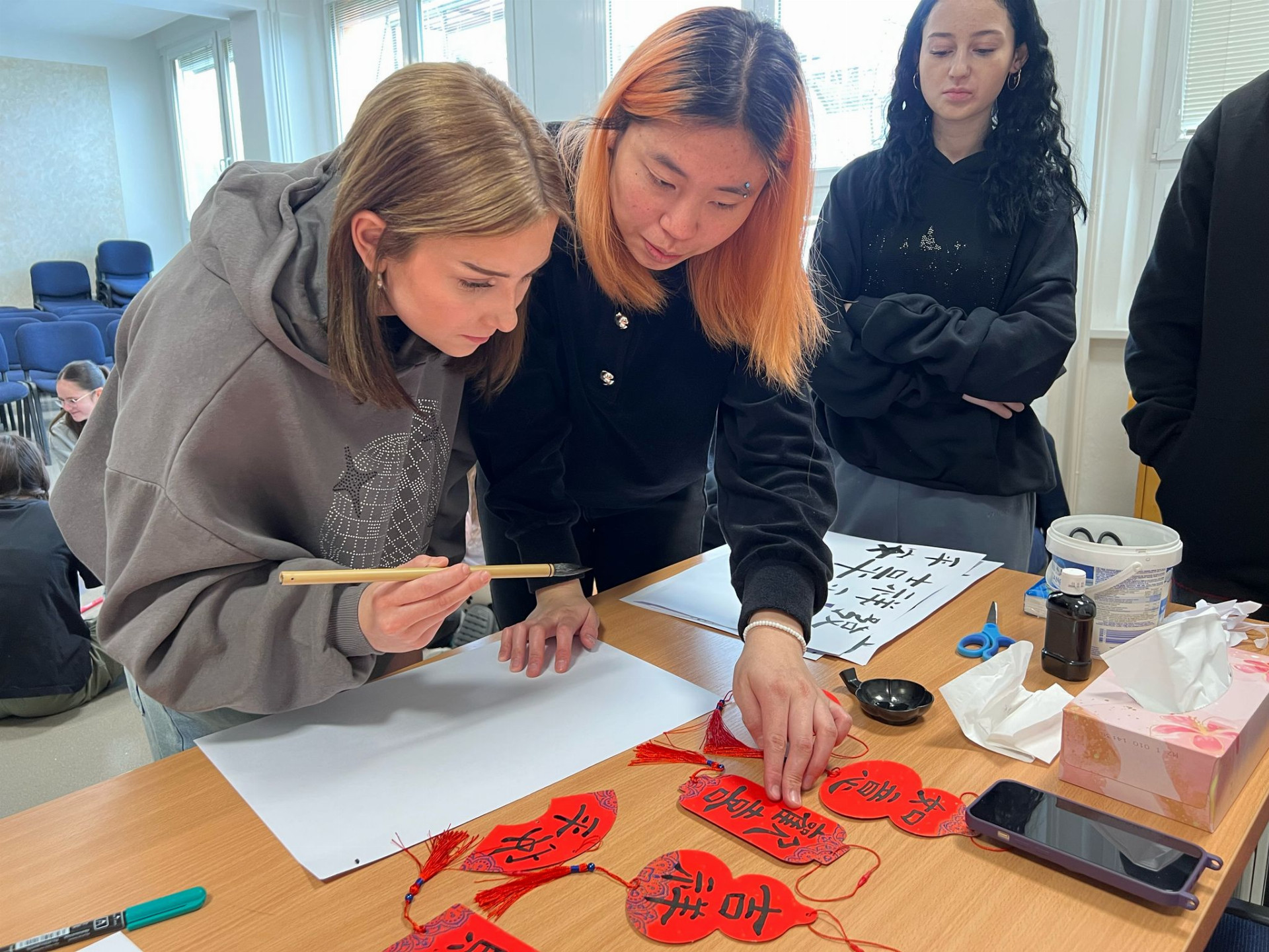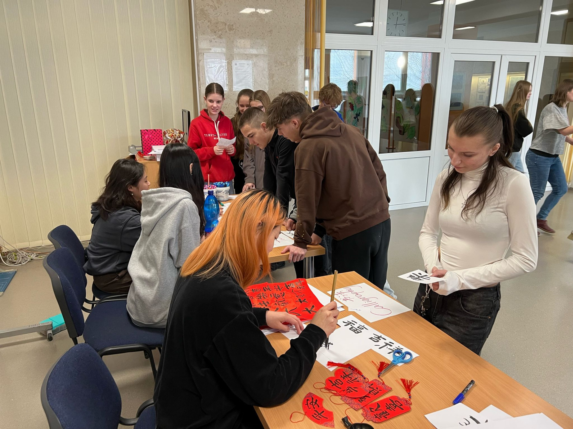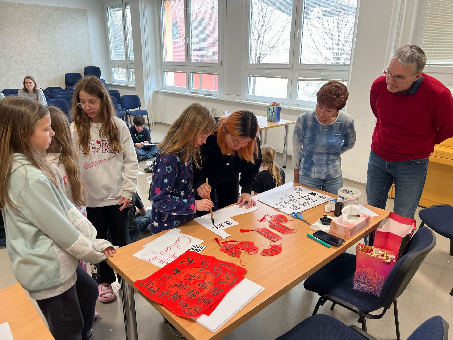 Součástí programu byly i odpolední aktivity, které pomohly stážistkám lépe poznat naše město a jeho okolí. Navštívily například Plumlovský zámek nebo Zlatou farmu ve Štětovicích, kde měly možnost ochutnat místní produkty a pohladit si domácí zvířata. Celý týden zakončil páteční Global Village, kde stážistky v respiriu školy prezentovaly své země prostřednictvím interaktivních stánků, tradičních předmětů a ukázek kulturních zvyků. Enola nás zde navíc seznámila se základy kaligrafie, což byl pro mnoho studentů jedinečný zážitek.
